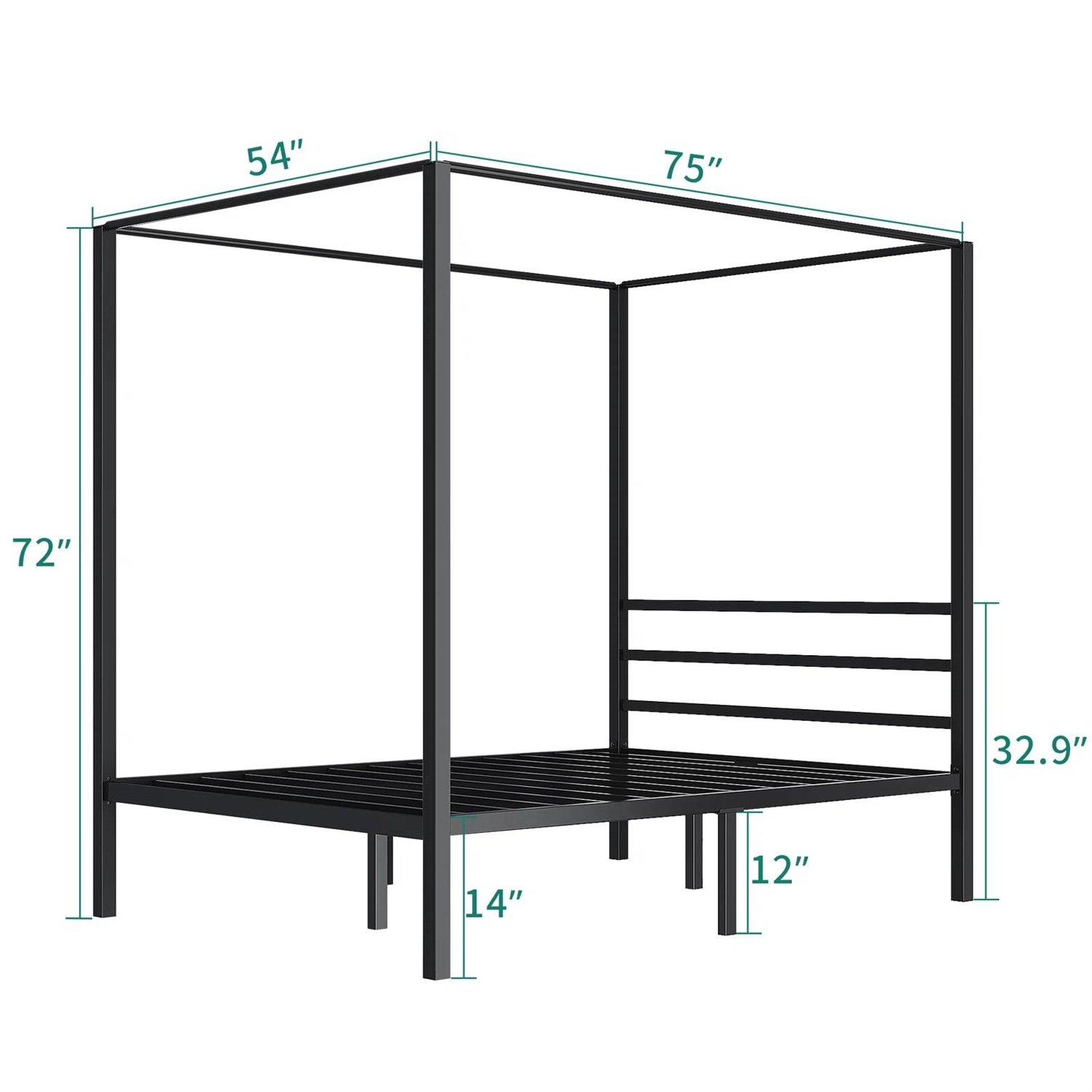 This Full size Modern Four Poster Metal Canopy Bed in Black Finish combines a minimalist aesthetic with a gorgeous look in the bedroom and is made from sturdy metal for stability and durability. Comes with baseless safety metal slats and center legs for full support for you and your mattress. The support legs in the middle of the bed frame can improve overall stability. The sturdy slats provide strong support and prevent the mattress from sagging, which can prolong the life of your mattress. Beneath the canopy, the bed has a storage space of up to 12 inches, where you can store your suitcases and other items. The classic, simple look offers your bedroom a peaceful and harmonious aesthetic. The thick and sturdy frame is made of metal, providing a longer service life. Please follow the instructions, and professional installation recommended Box Spring is Needed.