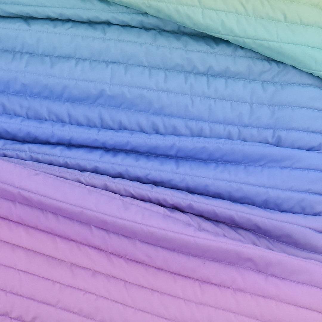 Bring a whole new level of excitement to your kid's room through the vivid coloring of this Rainbow Ombre Quilt Set. The trendy ombre design is perfect for blending this quilt set into an existing bedroom theme and to help transition to a big kid room. If your kids are all about bright colors, then we have the perfect quilt set for them! The design on this Rainbow Ombre Quilt Set brings together all the colors of the rainbow to create a wonderful eye catching pattern. This Rainbow Ombre Quilt Set will make your child's bed the focal point of the space. The pastel colors truly shine in both the quilt and the shams.