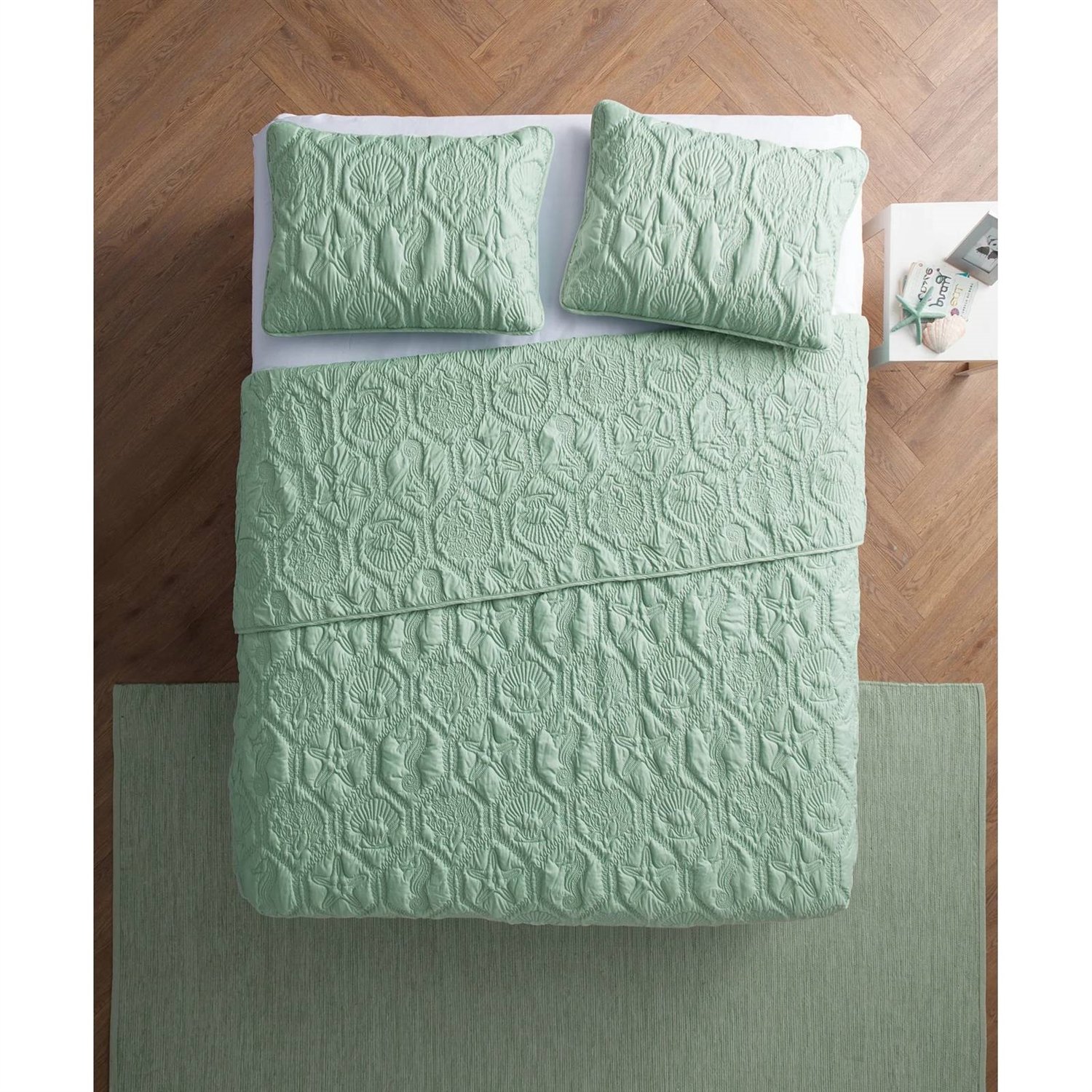 This King Coastal Beach Starfish Seashell Seahorse Light Green Teal Quilt Set has everything you need to bring a cool, coastal vibe to your space all year long. Featuring a subtle embossed sea life pattern, the set includes coordinating shams for a complete staycation-worth look.