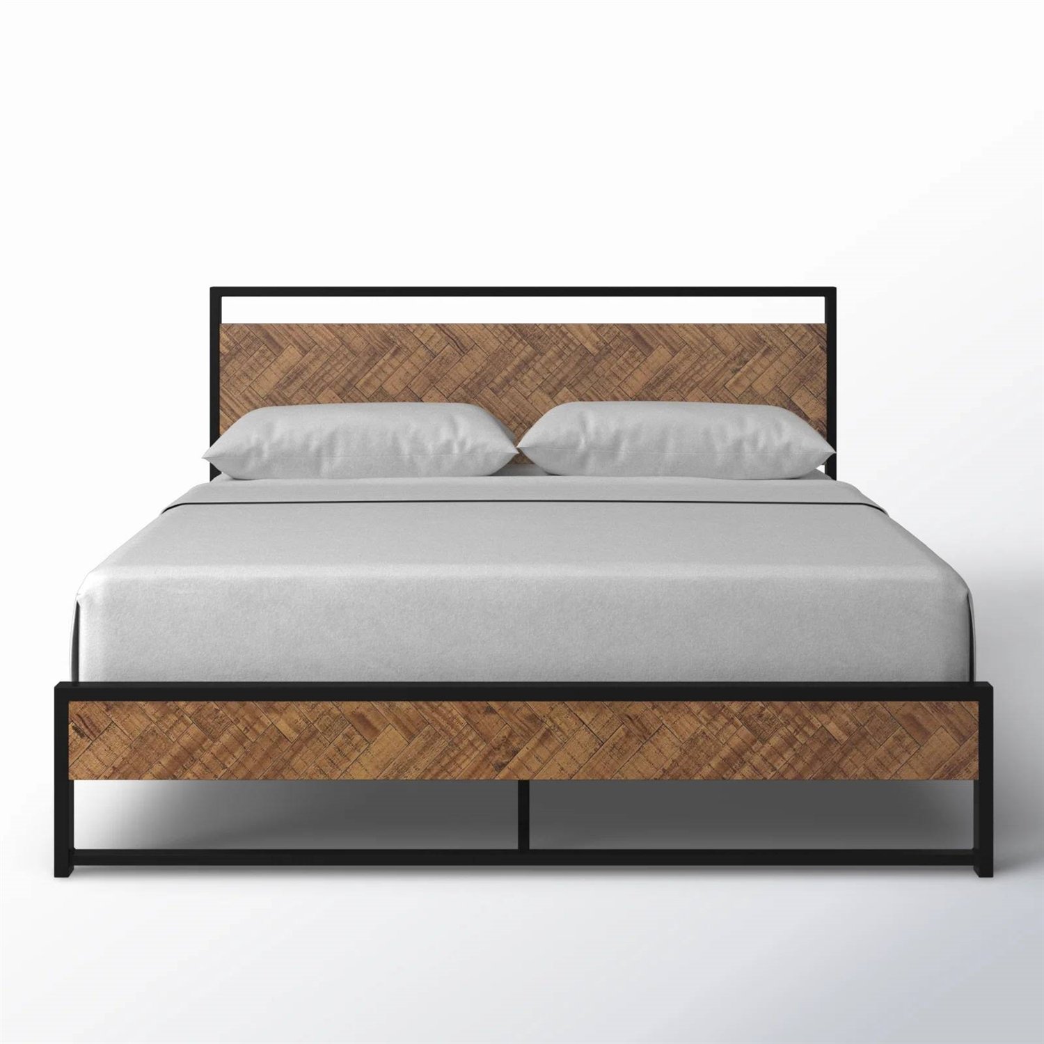 Combining modern design with an industrial touch, this Queen Modern Industrial Metal Platform Bed Frame with Wood Headboard Footboard rounds out your bedroom's style. Built with a black metal frame and crafted from engineered wood, it shows off a clean-lined look. The headboard strikes a rectangular silhouette with a matching footboard, while a classic two-tone combo with a unique herringbone wood finish creates a cohesive look that's easy to pair with neutral and colorful accents. Plus, the clearance underneath gives you room for storing boxes and seasonal clothing. Best of all, no box spring is required – just add a mattress (sold separately).