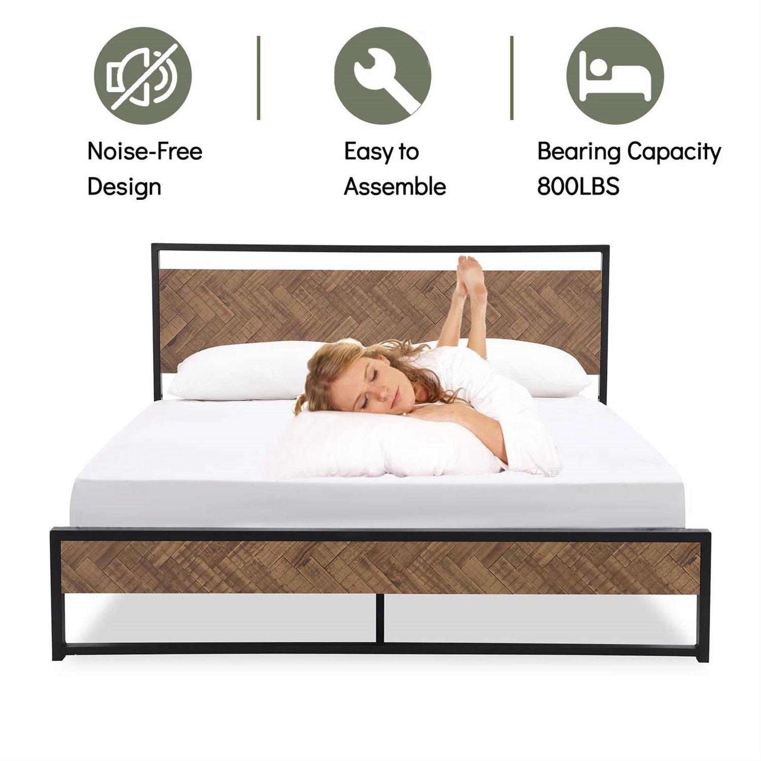 • Queen Modern Industrial Metal Platform Bed Frame with Wood Headboard Footboard