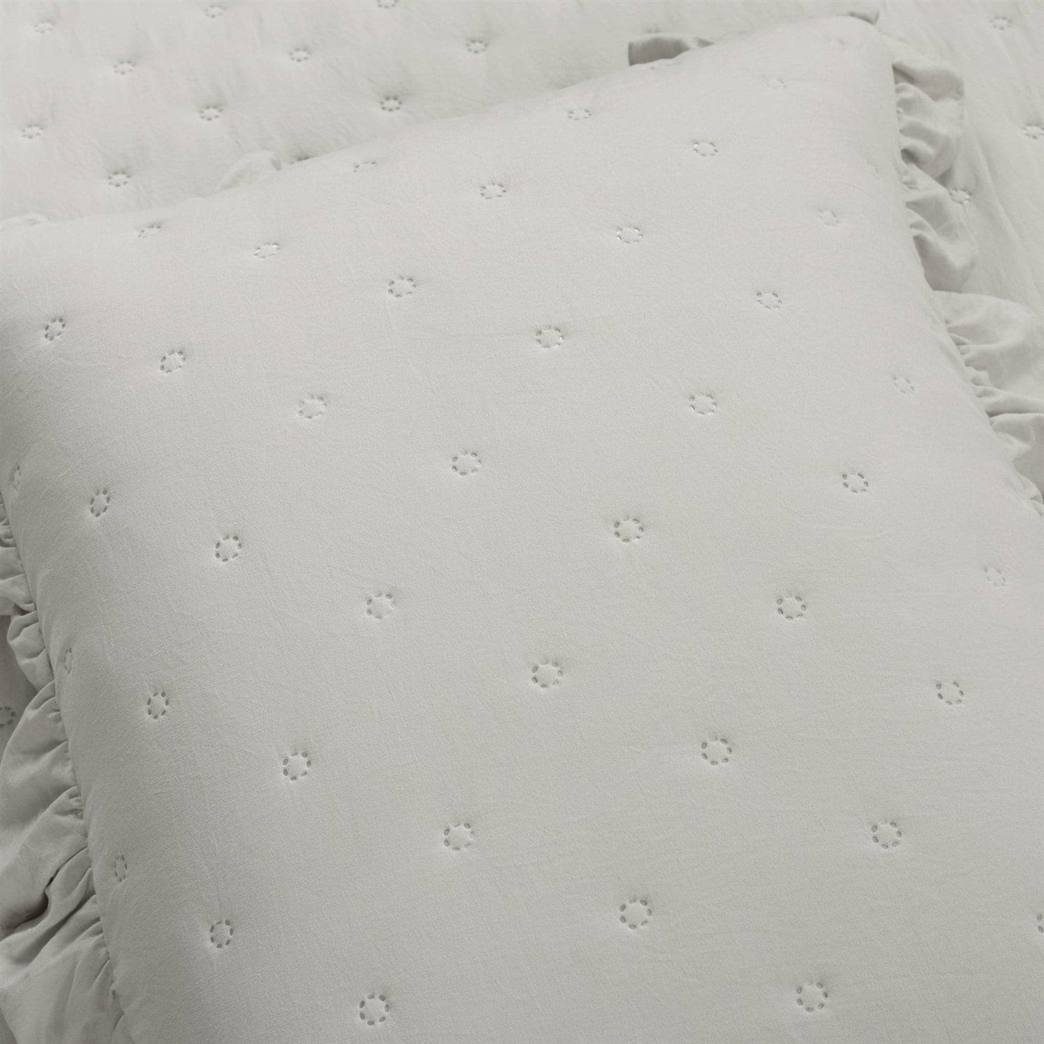 This King Size Lightweight Light Grey Ruffle Reversible Oversized 3 Piece Quilt Set has cozy cottage style with a chic flair. Soft crinkled fabric and quilted tufting create an unmatched texture you'll love to cozy up in. Airy ruffles edge the quilt and two matching shams, giving a feminine touch. The lightweight poly fill ensures all season comfort. Add this delightful Ruffle Reversible Oversized 3 Piece Quilt Set to your primary, guest, or teen's bedroom to complete your charming personal style. The quilted detailing across the fabric adds dimension and extra comfort. You'll love the ruffled edges that give this set extra pizazz. This Ruffle Reversible Oversized 3 Piece Quilt Set includes a soft and luxurious quilt and two matching pillow shams. The pillow shams also have the ruffled edges!