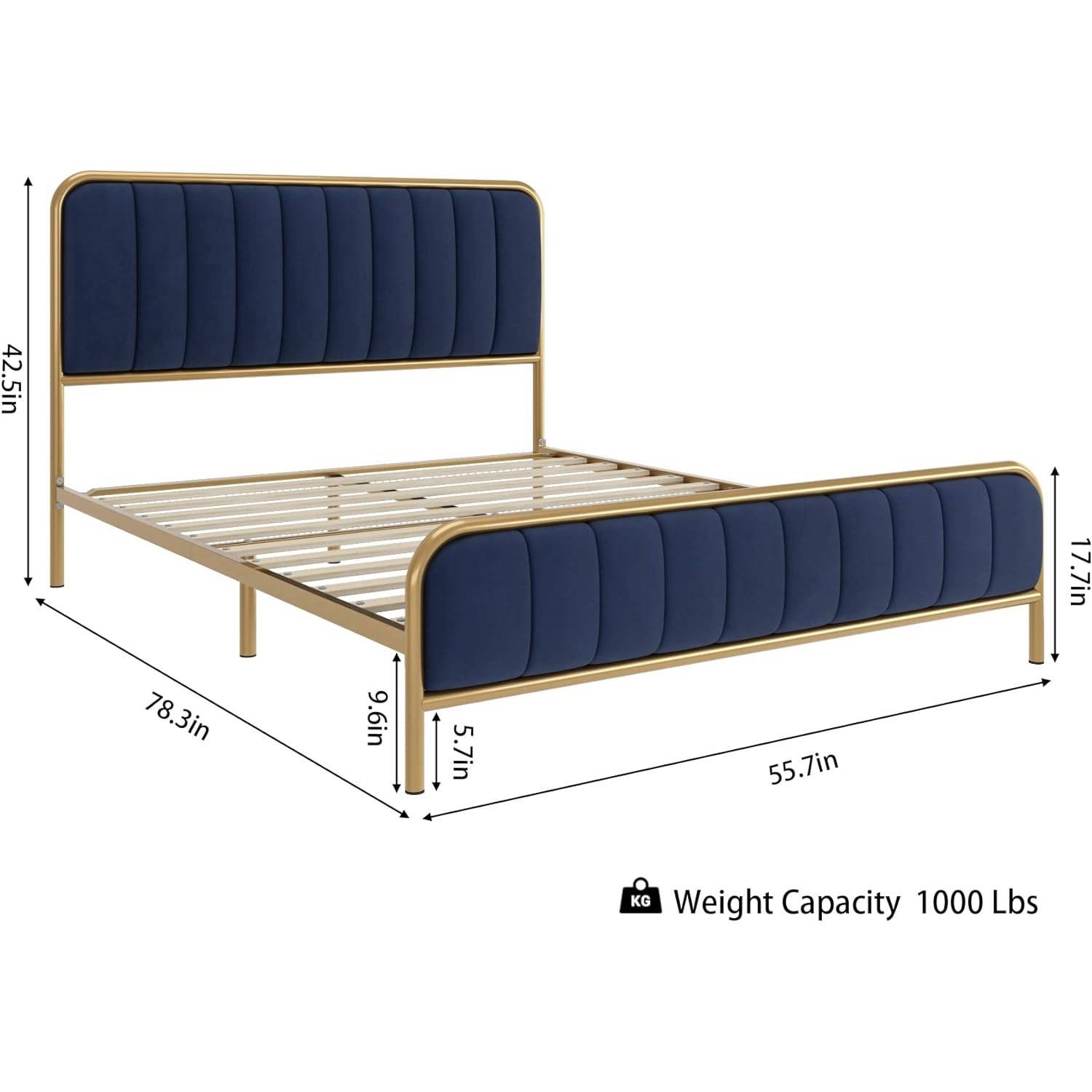 • Queen Gold Metal Platform Bed Frame with Navy Blue Velvet Upholstered Headboard