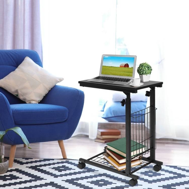 This Black Multipurpose Adjustable Height TV Tray Sofa End Side Table on Wheels can be used as an end table, wheeled computer tray, lamp table, TV tray, etc. Made from 15mm chipboard and sturdy steel frame, the frame with an open, cantilevered design, load capacity up to 55lbs. Compact size, space-saving and light-weight design, this simple stylish side table is functional and suitable for any decor of your room, perfect combination with other furniture accessory. Slides under sofas with ease! Comes with rolling casters ,this snack table easy to slip under sofas, you can reach the items on top without standing, great on both carpet & wooden floors and prevents scratches. Lower steel mesh provided extra storage space for books, magazines , etc.