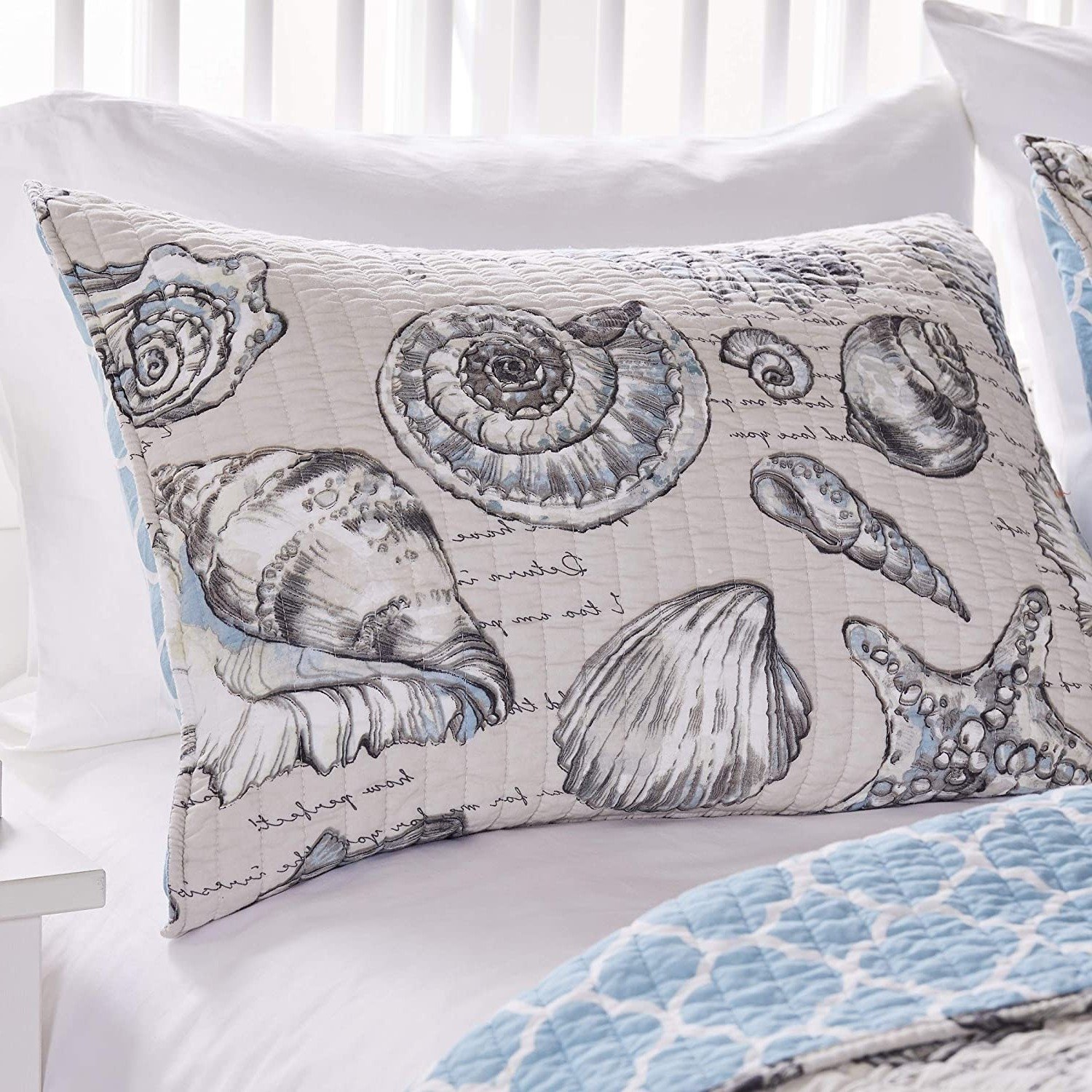 Time for a bedroom beach escape makeover! Beach scenes and fresh ocean breezes are brought to mind with this stunning 3 Piece Microfiber Beach Shells Coastal Quilt Set, King/California King . This quilt set offers seashells and dreamy poetic phrases to lull you into a seaside slumber. Colors include blue, alabaster, taupe, white and charcoal on a linen ground. Reverses to a complimentary fishnet print. Decorative quilting enhances the durability of each piece. Oversized for better coverage on todays deeper mattresses.
