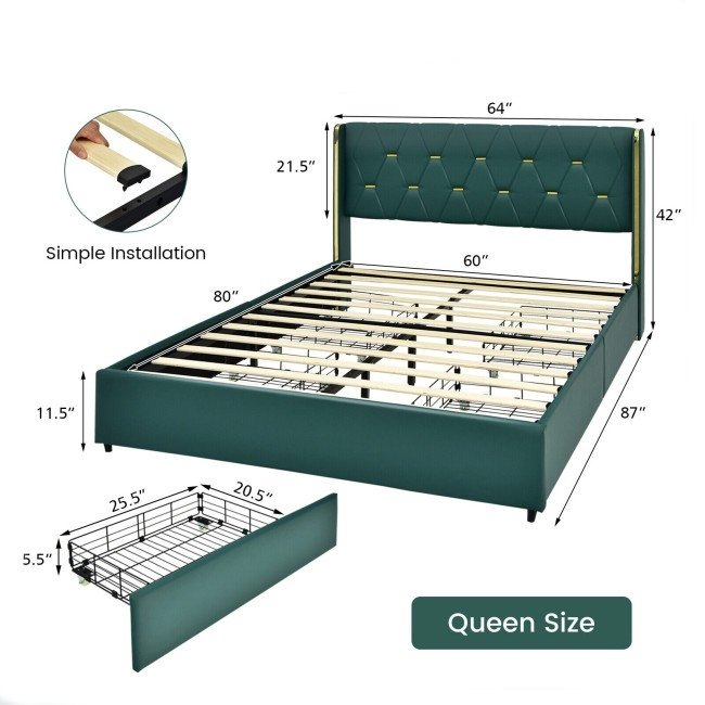 This Queen Size Green/Gold Linen Headboard 4 Drawer Storage Platform Bed is designed with 4 large drawers to accommodate your pillows, bed sheets, seasonal clothes and more. Crafted of high-density sponge and breathable linen fabric. The steel construction is sturdy enough to withstand a 660 lbs weight. With a tufted headboard, the bed frame looks very lavish and elegant, which definitely brings a sense of fashion to your bedroom. More, its installation is very simple. Each slat can be firmly installed by a hand pressing.