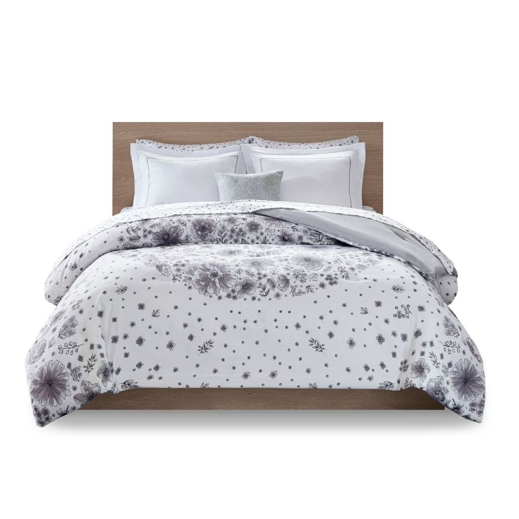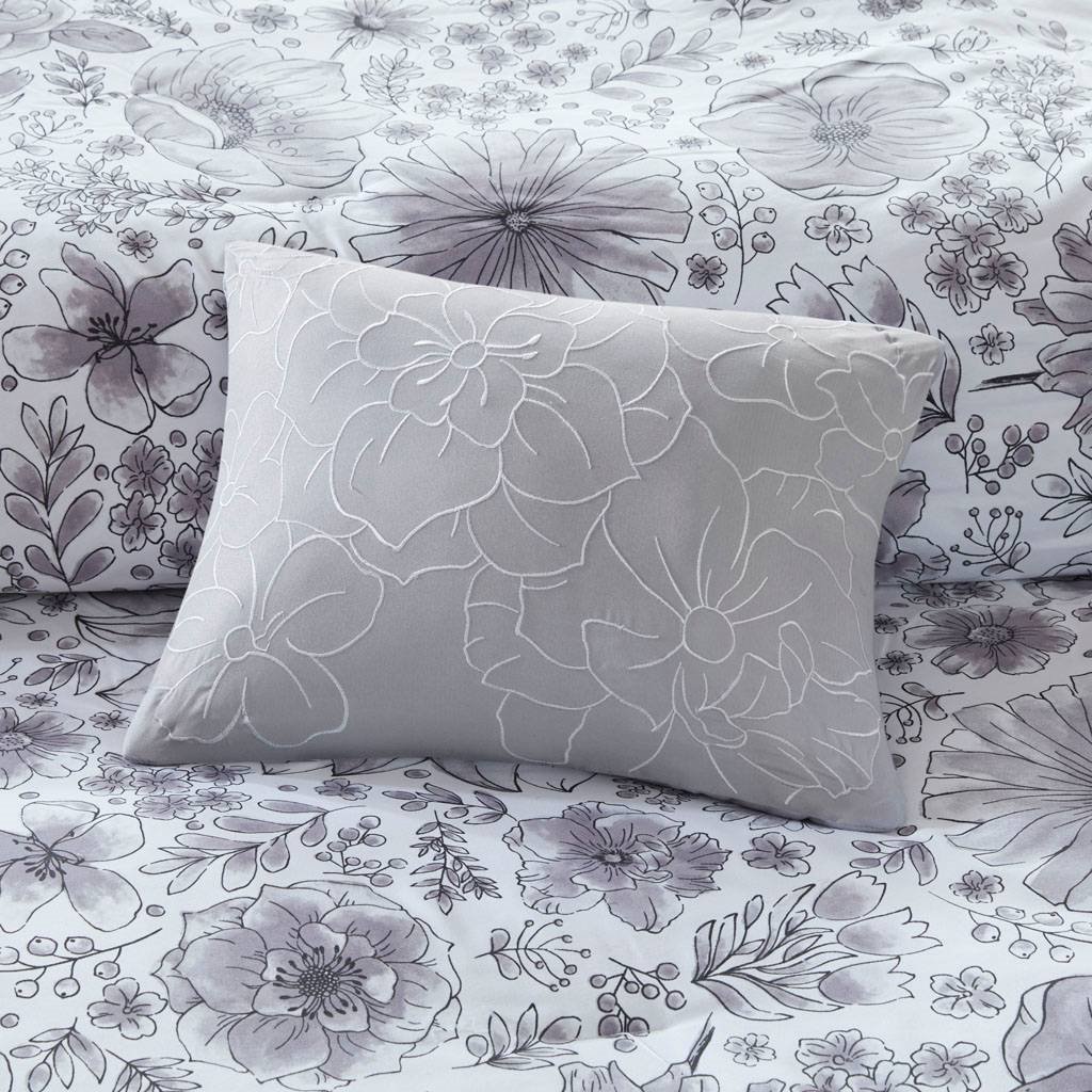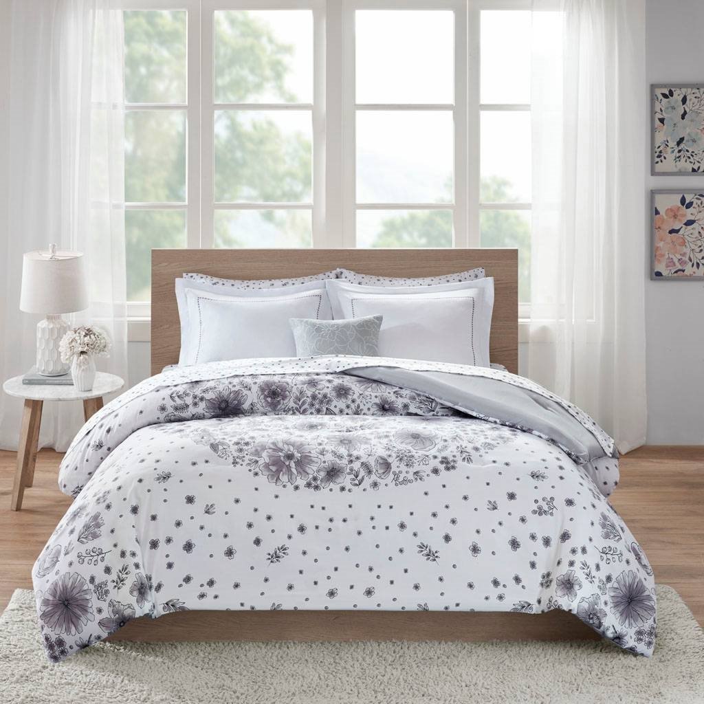 • Twin XL 6-piece White Grey Floral Pattern Microfiber Comforter Set