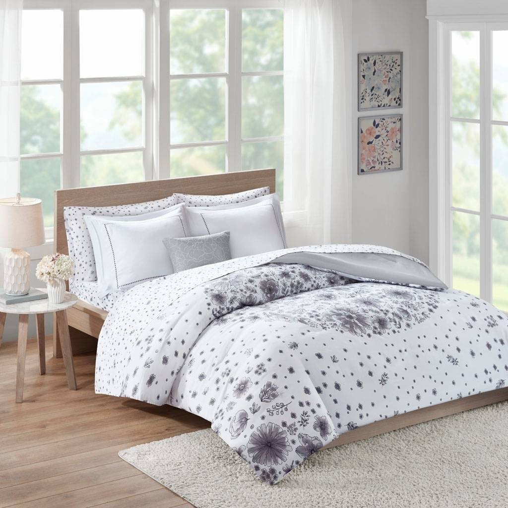 • Twin size 6-piece White Grey Floral Pattern Microfiber Comforter Set