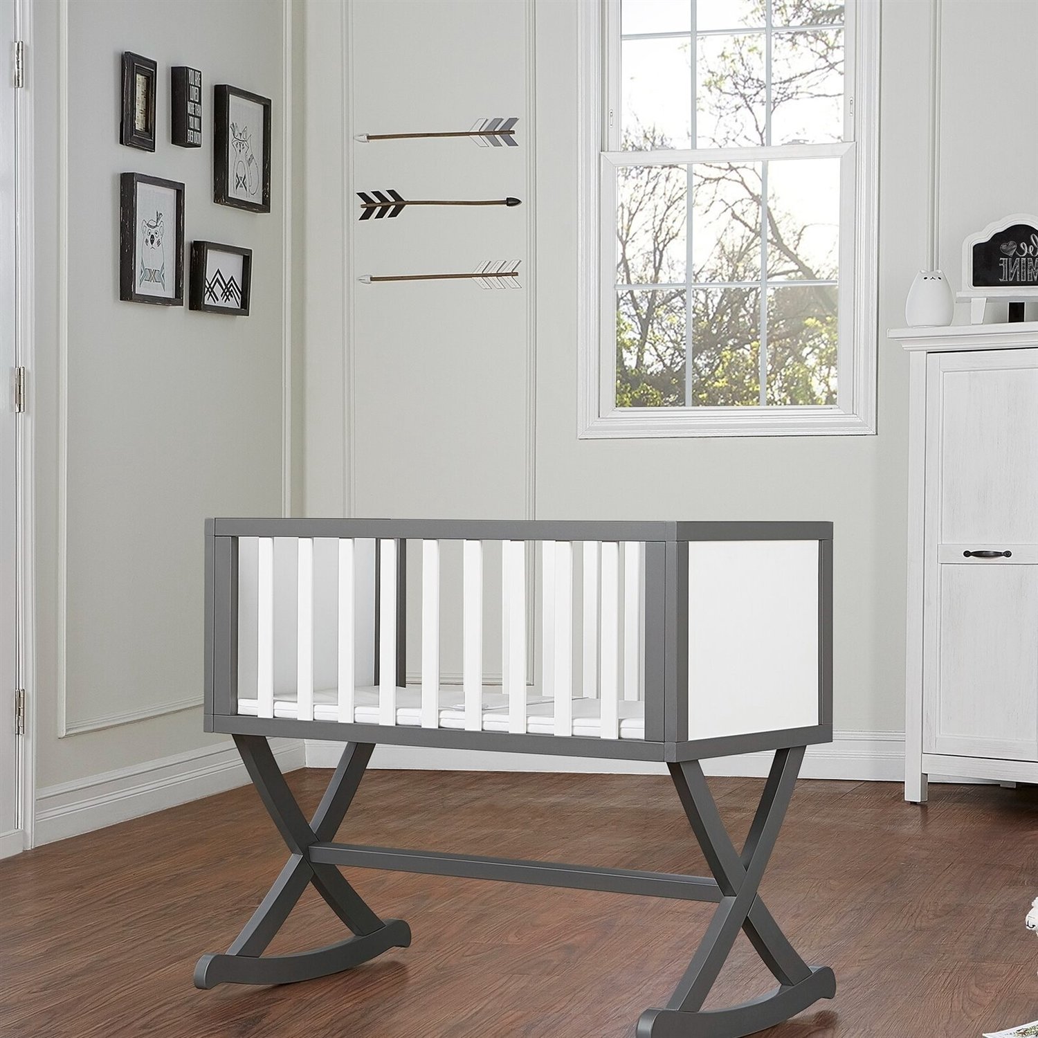 This Solid Wood Rocking Baby Glider Cradle with Crib Mattress in Grey White Finish creates a cozy nest-like surrounding for your newborn. This cradle offers a simple and modern design by incorporating straight lines, a solid side panel with a soft mattress pad, and an x-cross base, which allows parents to rock gently their babies to sleep with sophisticated iron decors and pops of geometric prints that inspire a plush, peaceful, all-night comfort.