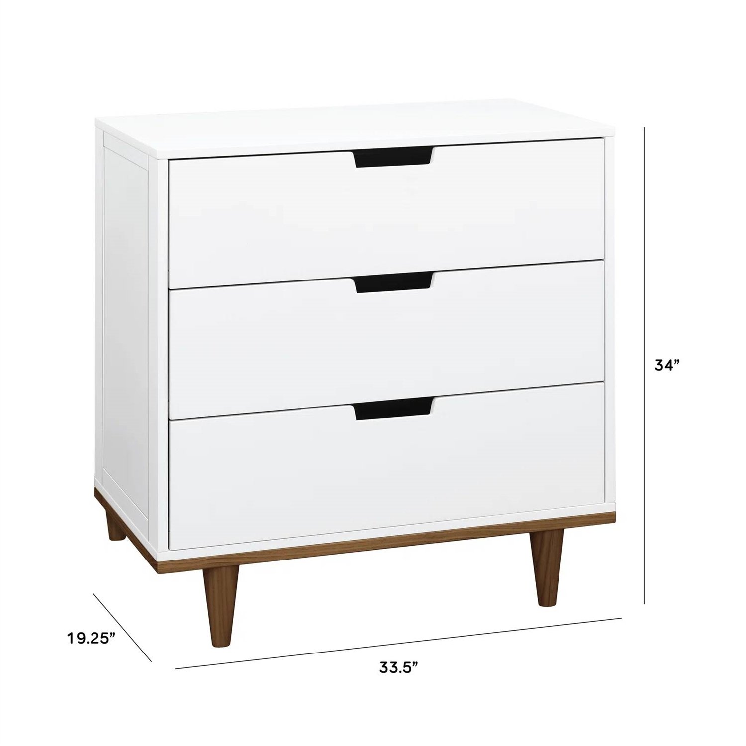 Tuck away all your baby's needs in this Modern Mid-Century Style 3-Drawer Dresser Chest in White Walnut Wood Finish will add a pop of personality to any modern nursery, the Dresser features three spacious drawers on smooth, pre-installed ball-bearing metal glides for easy assembly and accessibility. Pair with an available removable changing tray for a functional and stylish addition to the baby's space. 3 spacious drawers that are built to hold all the adorable baby clothes, blankets, and more. Changing stations now. Big kid dresser later! This dresser is designed so that you can add a changing tray (#M0219) to use as a convenient changing station during the baby years. Ball-bearing drawer glides make opening the drawers easy even when your hands are full with your baby. We've done the hardest part for you! Drawer glides come pre-assembled so that you can put your dresser together more quickly and start enjoying your nursery sooner. Made of solid sustainable New Zealand pinewood and TSCA compliant engineered wood -only the best for your baby. Say goodbye to toxic chemicals! Finished in a non-toxic multi-step painting process and lead and phthalate safe. Rest assured knowing it exceeds ASTM International and U.S. CPSC safety standards. Stop mechanism and anti-tip kit included for additional safety.