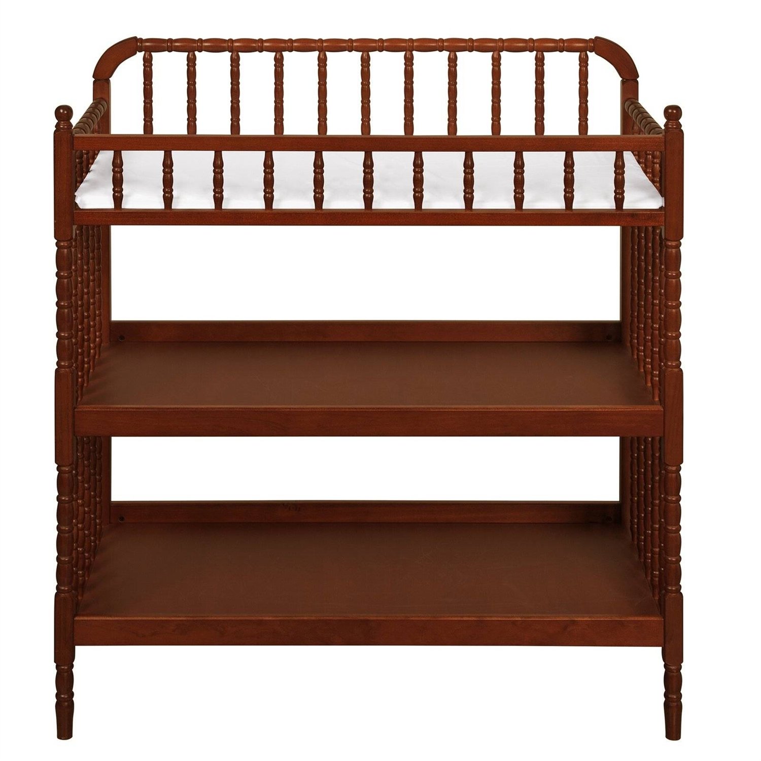 Delight in traditional beauty with this Cherry Wood Changing Table with 1-inch Waterproof Changing Pad. Intricate spindle posts deliver classic grace from top to toe, for a perfect pairing with the Jenny Lind Crib. Spacious, open shelves keep diapers and lotions within easy reach for convenient changings. Changing pad and safety strap are included.