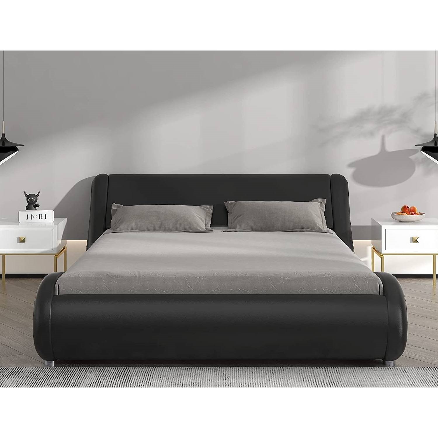 • Full Modern Black Faux Leather Upholstered Platform Bed Frame with Headboard