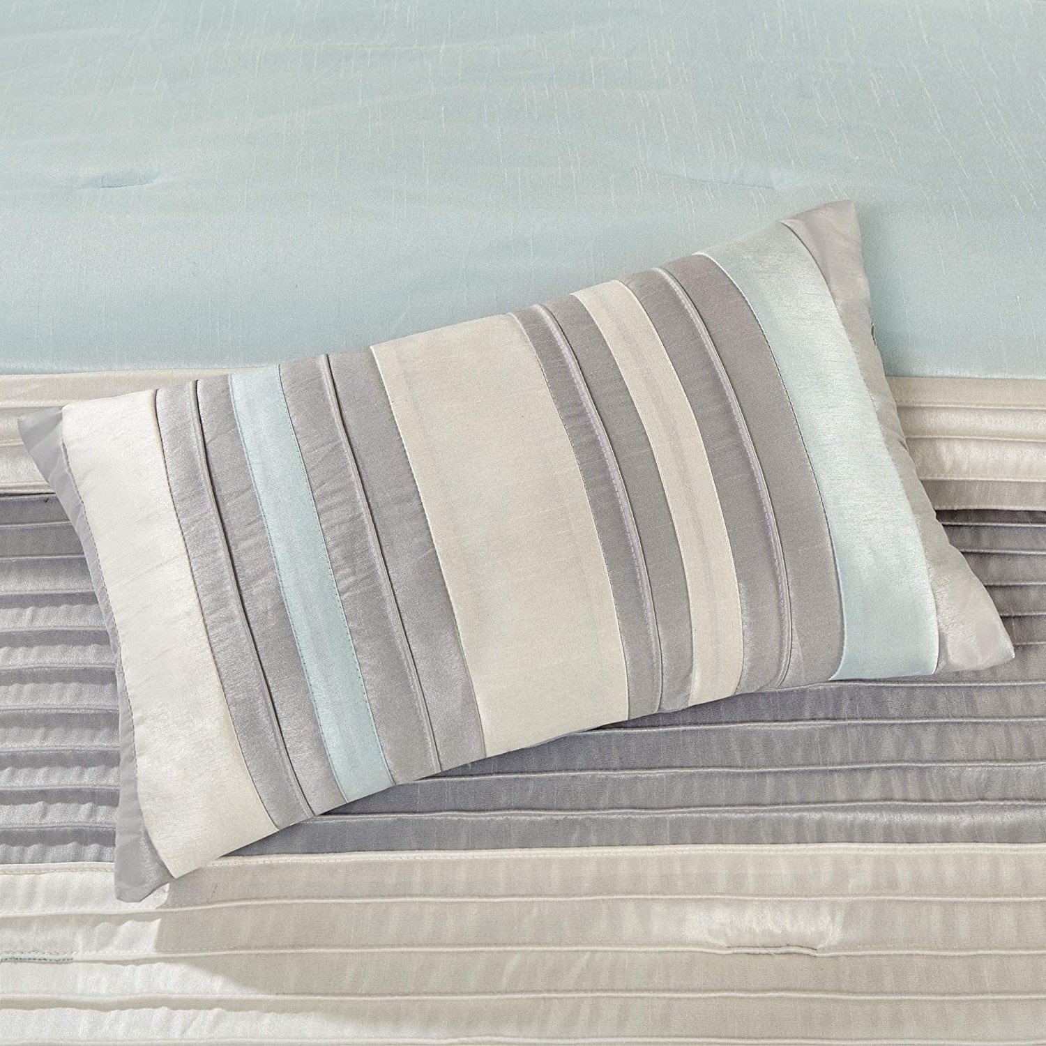 Relax in complete luxury with this Queen Size 7 Piece Bed In A Bag Comforter Set Faux Silk Blue Stripes. Sleek piping of the fabric on the comforter set and pillows gives a strong visual dimension. Everything is included with this jumbo set. Come with Comforter, Bed Skirt, 2 Pillow Shams, 3 Decorative Pillows! Machine wash, gentle cycle and separately. Tumble dry low. Spot clean decorative pillows.
