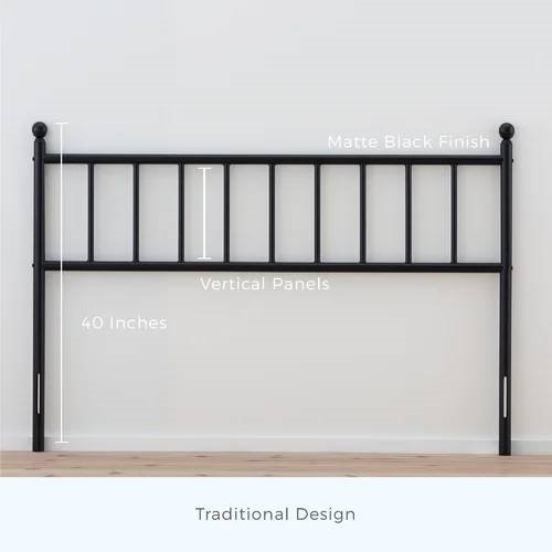 This King size Traditional Farmhouse Headboard in Matte Black Metal Finish helps complete your bedroom ensemble, with its sleek shape and traditional design. It's made from metal in a black matte finish, and it has open vertical slats and decorative finials that fit well within your space — no matter the style of your room or its color palette. This headboard is 40" tall when measured with both legs. Plus, you can easily mount it to your bed frame — all hardware and plates included.