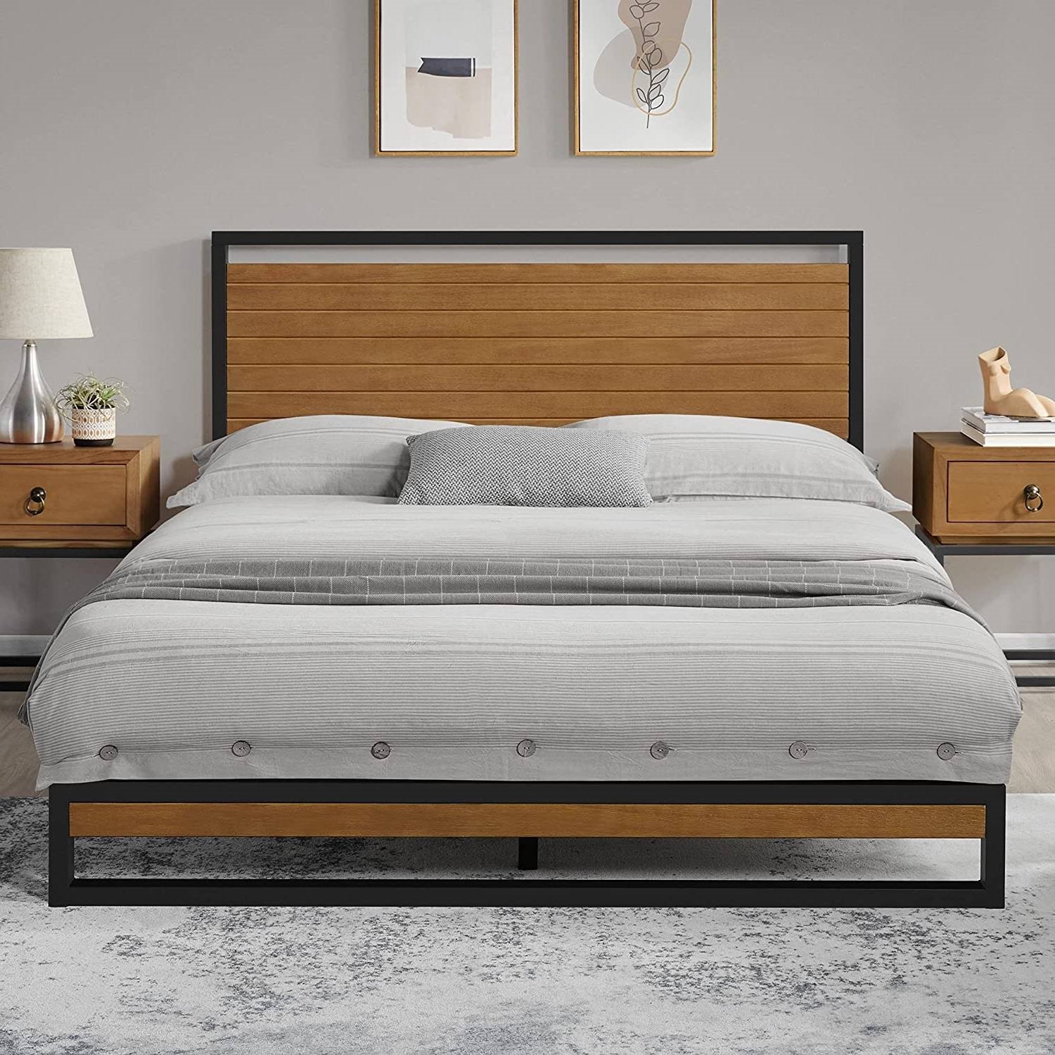 Full size Modern Metal Platform Bed Frame with Solid Brown Wood Slatted Headboard
