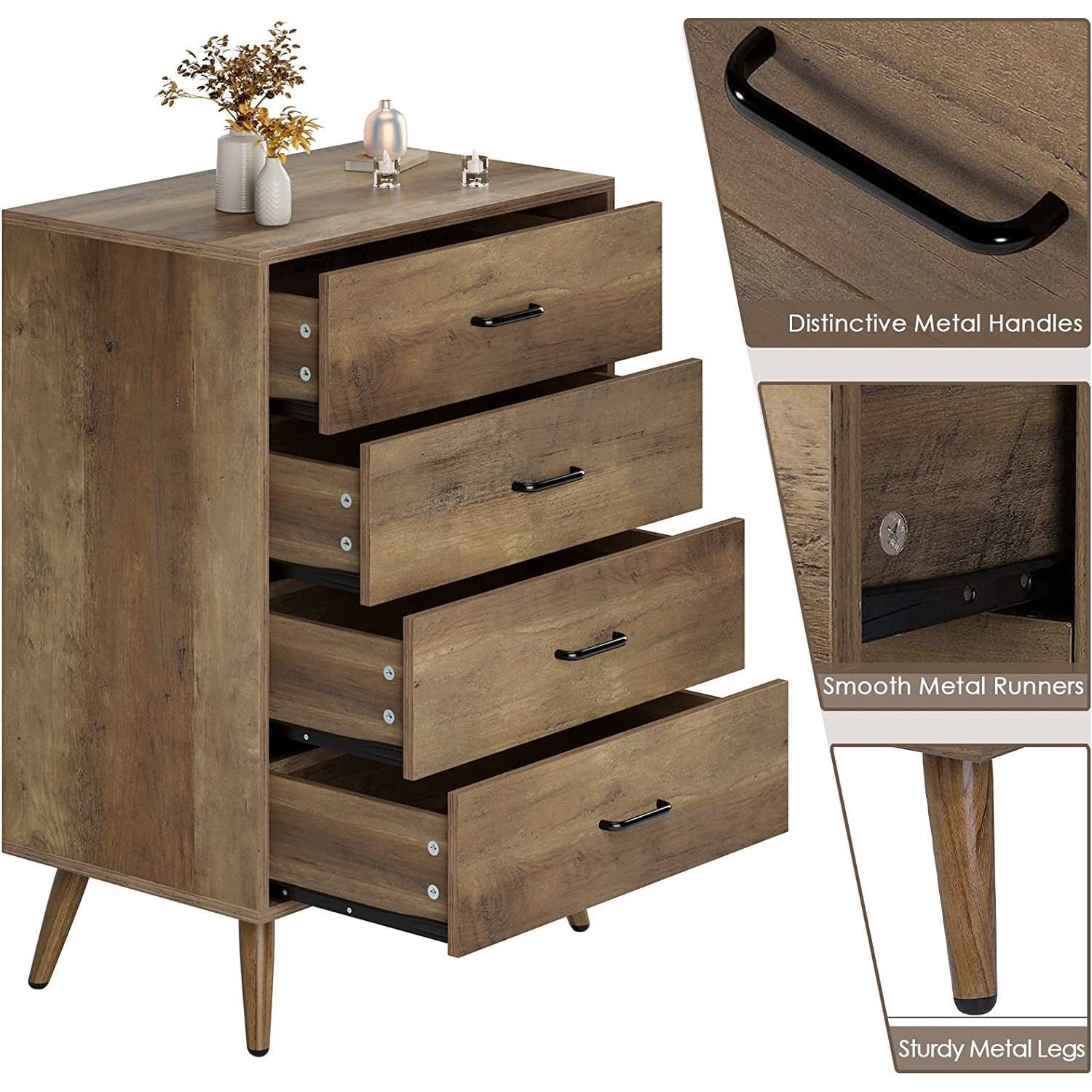 • TIMELESS ELEGANCE: Inspired by mid century modern style, with a stylish retro wooden structure, classic metal handles and elegant tapered legs, this 4 drawer dresser is an ideal piece to breathe new life into any room or space
